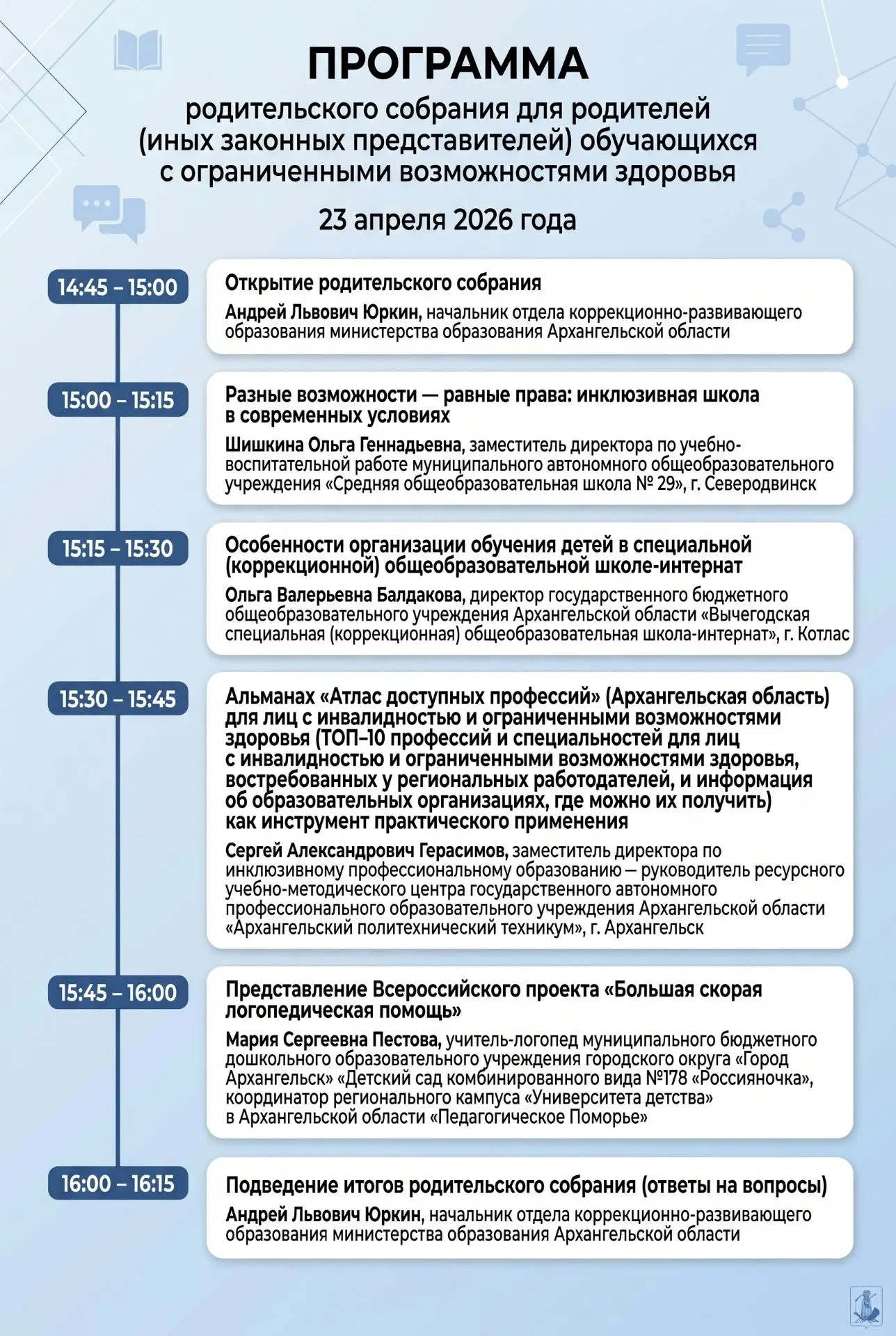 23 апреля 2026 года в 14:45 в онлайн-формате состоится родительское собрание для родителей (законных представителей) обучающихся с ограниченными возможностями здоровья (ОВЗ).